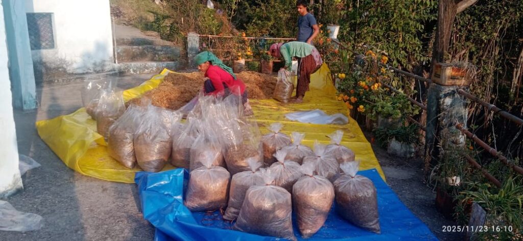 In het dorp Chidiyali, goed bereikbaar via de weg en met voldoende water, is een productielocatie voor de zakken met teeltmateriaal (stro en broed) opgezet. Van 23 t/m 25 november 2025 zijn daar vrijwilligers opgeleid om de productielocatie soepel te laten functioneren. Tijdens deze opleiding zijn 100 zakken klaargemaakt voor distributie aan de boerinnen, die in de komende weken met de teelt starten.